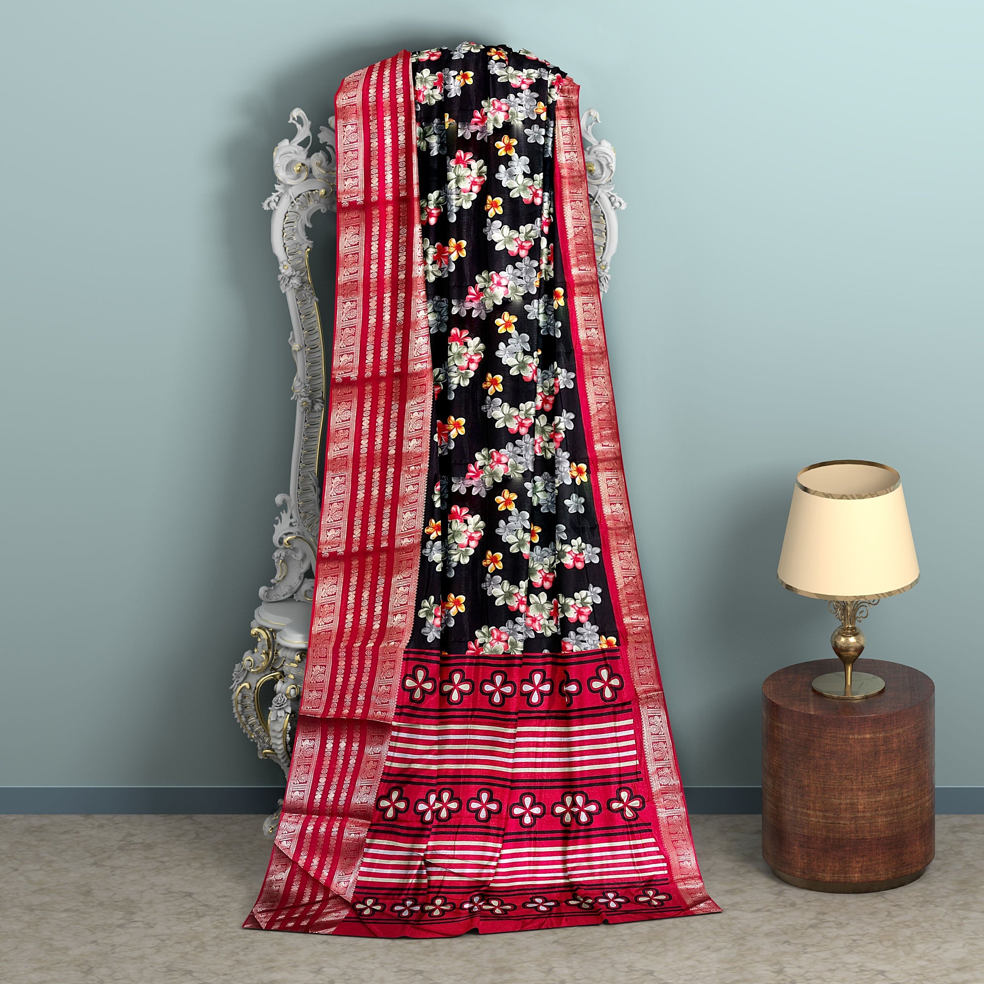 Add timeless elegance to your wardrobe with this stunning dark green floral printed saree featuring a luxurious mustard-golden zari border. The rich silk-blend fabric drapes beautifully, while the vibrant floral pattern adds a fresh, feminine touch. Perfect for weddings, festivals, parties, and special occasions, this saree blends traditional charm with modern style.